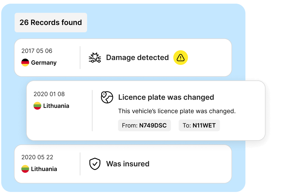 With carVertical’s Damage data, we check over 300 million records to show you exactly where and when it occurred, and what the repairs might cost (if available). If our AI detects damage in recorded photos, that information will also appear in your report, even without an official record.
