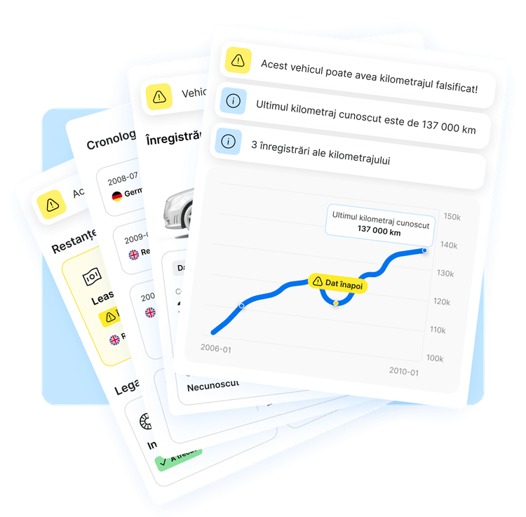 Cumperi second-hand? Scanăm peste 1000 de baze de date internaționale ca să te ajutăm să eviți afacerile păguboase și să te decizi dacă mașina chiar ți se potrivește.